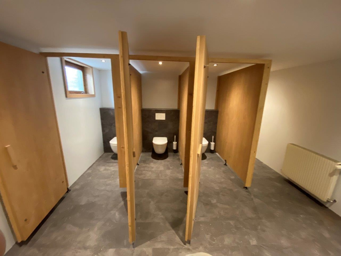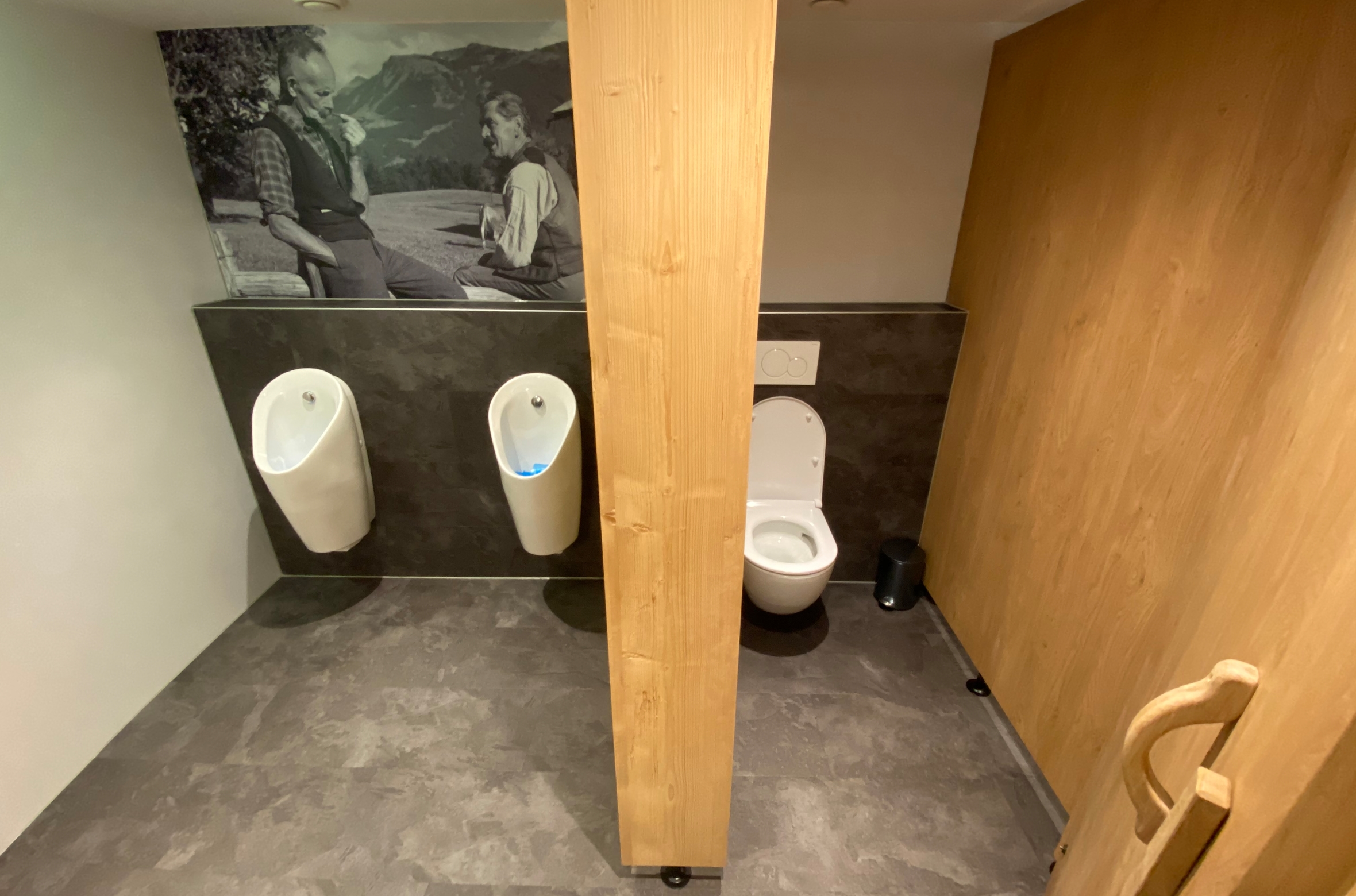 Neben den WC Anlagen wurden auch die Heizungsanlage und die Heizkörper im Gästebereich angepasst. Während dieser im großen Saal durch zwei neue ersetzt wurden, hat man den 6 Meter langen Heizkörper in der „Wälder Stuba“ abgehängt, schwarz lackiert und neu angeschlossen. Nun glänzt der 6 Meter lange Heizkörper in einem satten schwarz.